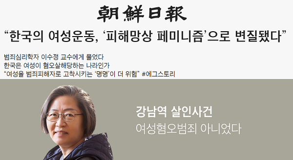 ํ•œ๊ตญ์˜ ํŽ˜๋ฏธ๋‹ˆ์ฆ˜์ด ํ”ผํ•ด๋ง์ƒ ํŽ˜๋ฏธ๋‹ˆ์ฆ˜์œผ๋กœ ๋ณ€์งˆ๋˜์—ˆ๋‹ค๋ฉด์„œ ํŽ˜๋ฏธ๋‹ˆ์ฆ˜๊ณผ ํ•จ๊ป˜ ์ด๋Ÿฌํ•œ ํ˜„์ƒ์„ ์ดˆ๋ž˜ํ•œ ์„ธ๋ ฅ(ํŽ˜๋ฏธ๋‹ˆ์ฆ˜ ํ•™๊ณ„)๊ณผ ์ •์น˜๊ถŒ ๋“ฑ์„ ๋น„ํŒํ–ˆ๋‹ค. ์ด์ˆ˜์ •์€ ์ด ์ธํ„ฐ๋ทฐ์—์„œ ์œค์„์—ด์ด ๋Œ€์„  ํ›„๋ณด ๋•Œ ํ•œ '(๋‚จ๋…€์— ๋Œ€ํ•œ) ๊ตฌ์กฐ์  ์ฐจ๋ณ„์ด ์—†๋‹ค'๋Š” ๋ฐœ์–ธ๋„ ์˜นํ˜ธํ•˜๋Š” ๋“ฑ ์—ฌ์ „ํžˆ ์œค์„์—ด ์ง€์ง€ ํƒœ๋„๋ฅผ ๋ณด์˜€๋‹ค.