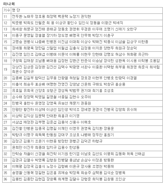 μœ‘κ΅°μ‚¬κ΄€ν•™κ΅ 11κΈ°λΆ€ν„° 36κΈ°κΉŒμ§€μ˜ ν•˜λ‚˜νšŒ νšŒμ› ε…¨ 250λͺ…μ˜ λͺ…단은 2005λ…„ 2μ›” λ™μ•„μΌλ³΄μ˜ μžλ§€μ§€μΈ <신동아>μ—μ„œ 졜초 κ³΅κ°œλ˜μ—ˆλ‹€. 이 λͺ…단은 μ „μˆ λœ 기쑴의 ν•˜λ‚˜νšŒ λͺ…단인 'λ°±μŠΉλ„ λͺ…단(128λͺ…)'의 였λ₯˜λ₯Ό λ°”λ‘œμž‘μ€ ν•˜λ‚˜νšŒ λͺ…λ‹¨μ˜ 'μ™„κ²°νŒ'이라 ν•œλ‹€.