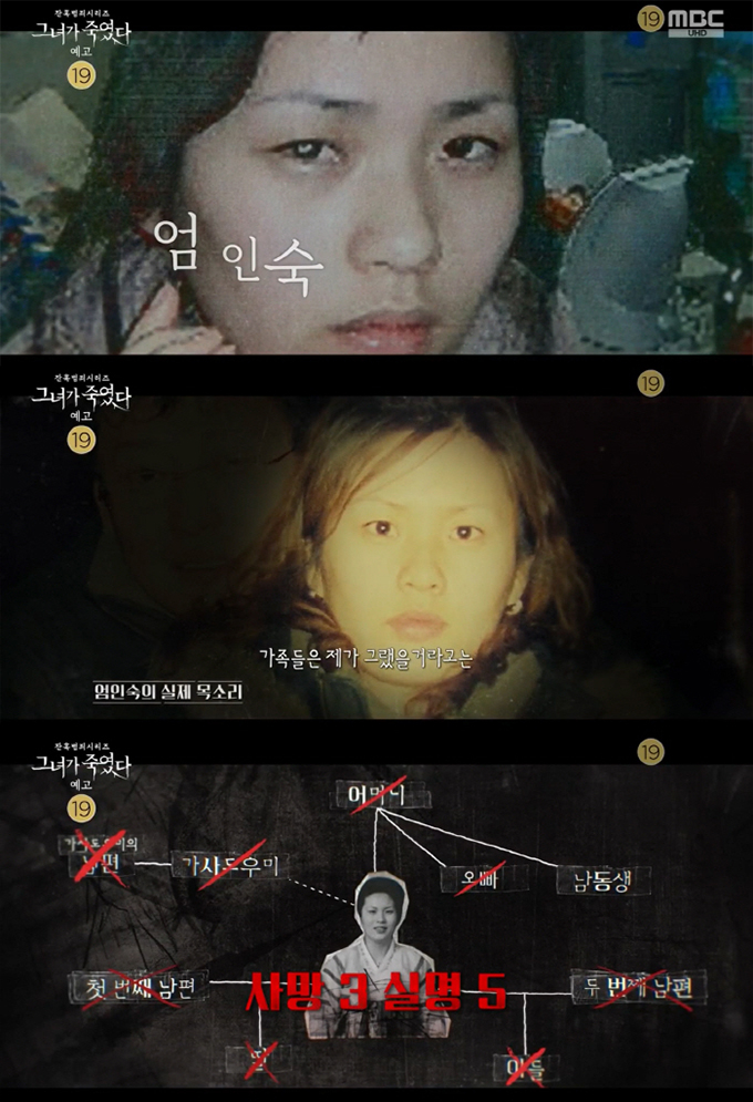 ์‚ฌ๊ฑด ๋ฐœ์ƒ 24๋…„ ๋งŒ์ธ 2024๋…„ 4์›” 29์ผ์— ๋‹คํ๋ฉ˜ํ„ฐ๋ฆฌ '๊ทธ๋…€๊ฐ€ ์ฃฝ์˜€๋‹ค' ์˜ˆ๊ณ ํŽธ์„ ํ†ตํ•ด ๋Œ€์ค‘์—๊ฒŒ ์–ผ๊ตด์ด ๊ณต๊ฐœ๋˜์—ˆ๋‹ค. ์—„์ธ์ˆ™์€ 2000๋…„ 5์›”๋ถ€ํ„ฐ 2005๋…„ 2์›”๊นŒ์ง€ 5๋…„๊ฐ„ 3๋ช…์„ ์‚ดํ•ดํ•˜๊ณ  7๋ช…์—๊ฒŒ ์ค‘์ƒ์„ ์ž…ํžŒ ํ˜์˜๋กœ 2006๋…„ ๋ฌด๊ธฐ์ง•์—ญ์„ ์„ ๊ณ ๋ฐ›์•˜๋‹ค.